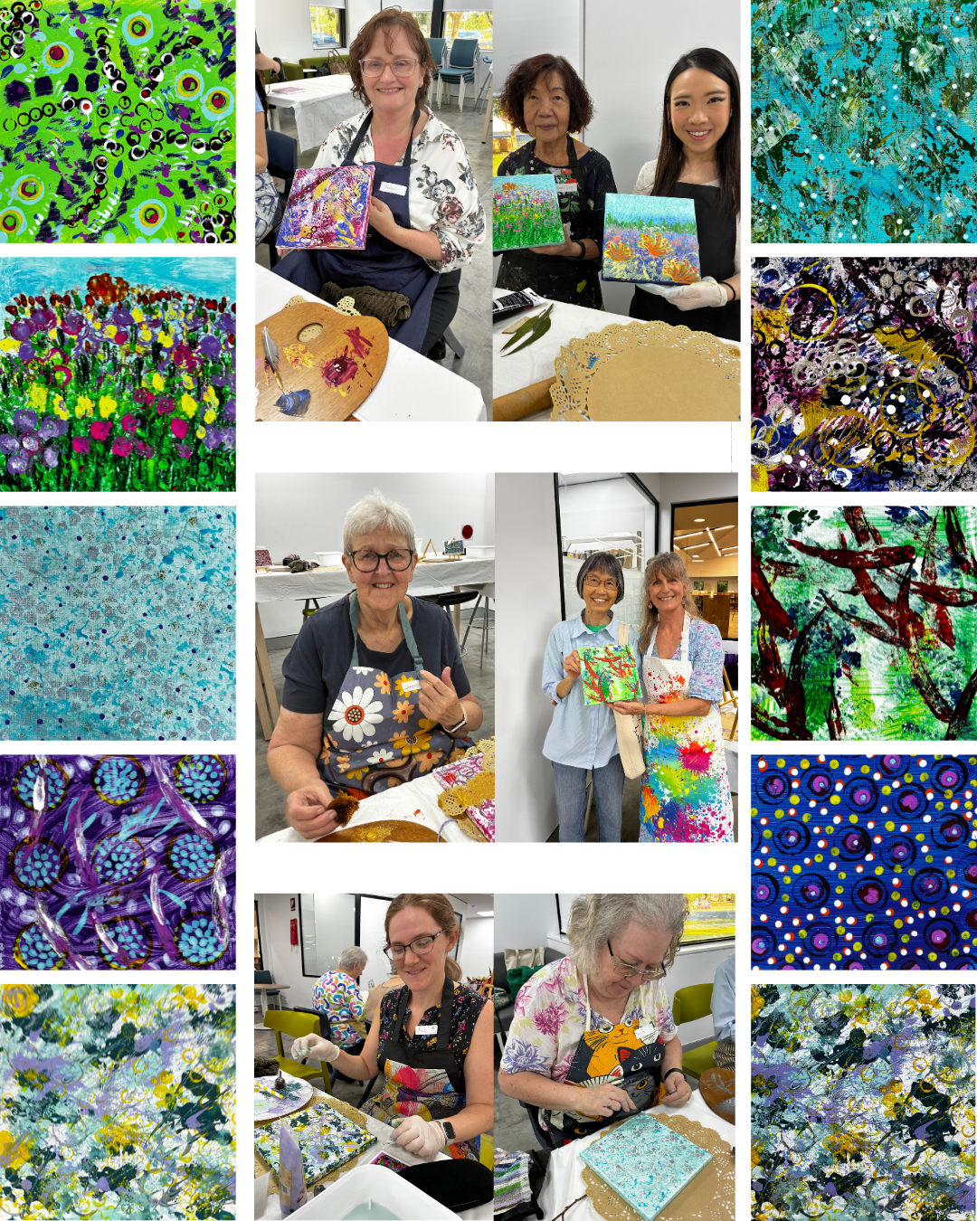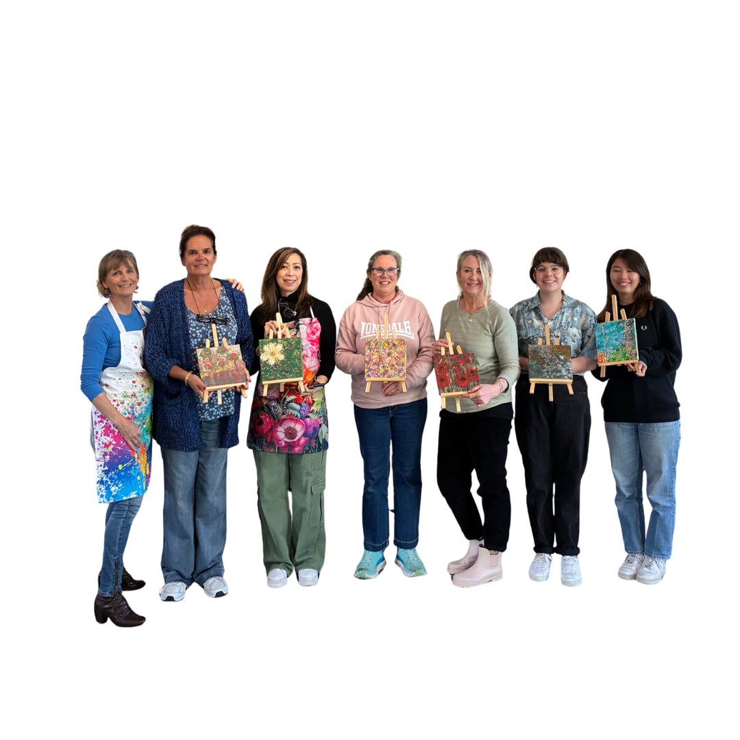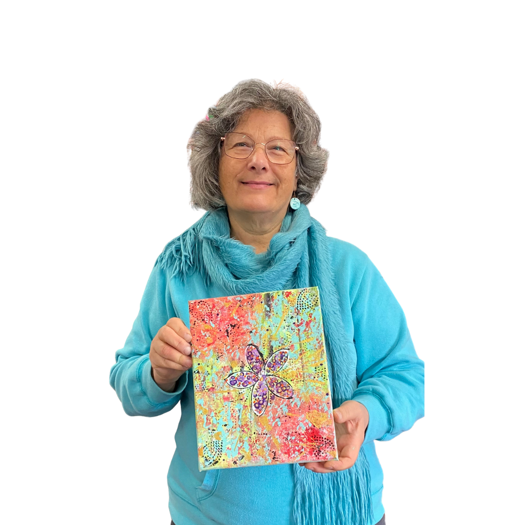 "I was excited to join Marie and the other women. I really enjoyed the whole process of mark making and use of many colours to create layers on my canvas to create my own personal art piece. I was amazed at each layer, how it changed and took on a different quality and feel. At one point I had to walk away and process what was showing up on the canvas. With Marie’s guidance and support I came back to my painting with fresh eyes and completed my art. Just WOW, such a pleasure to create my own unique art! Thankyou Marie, it was fun!"