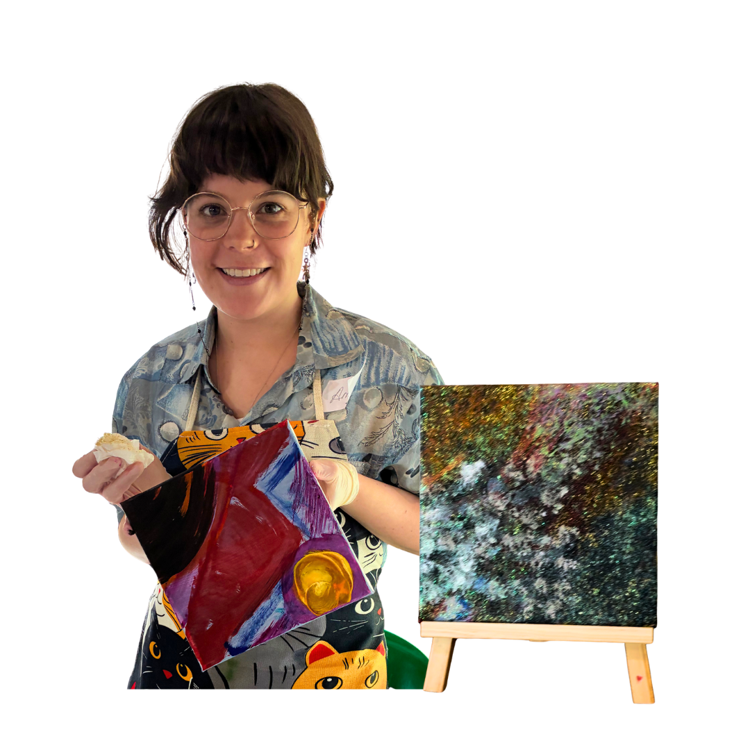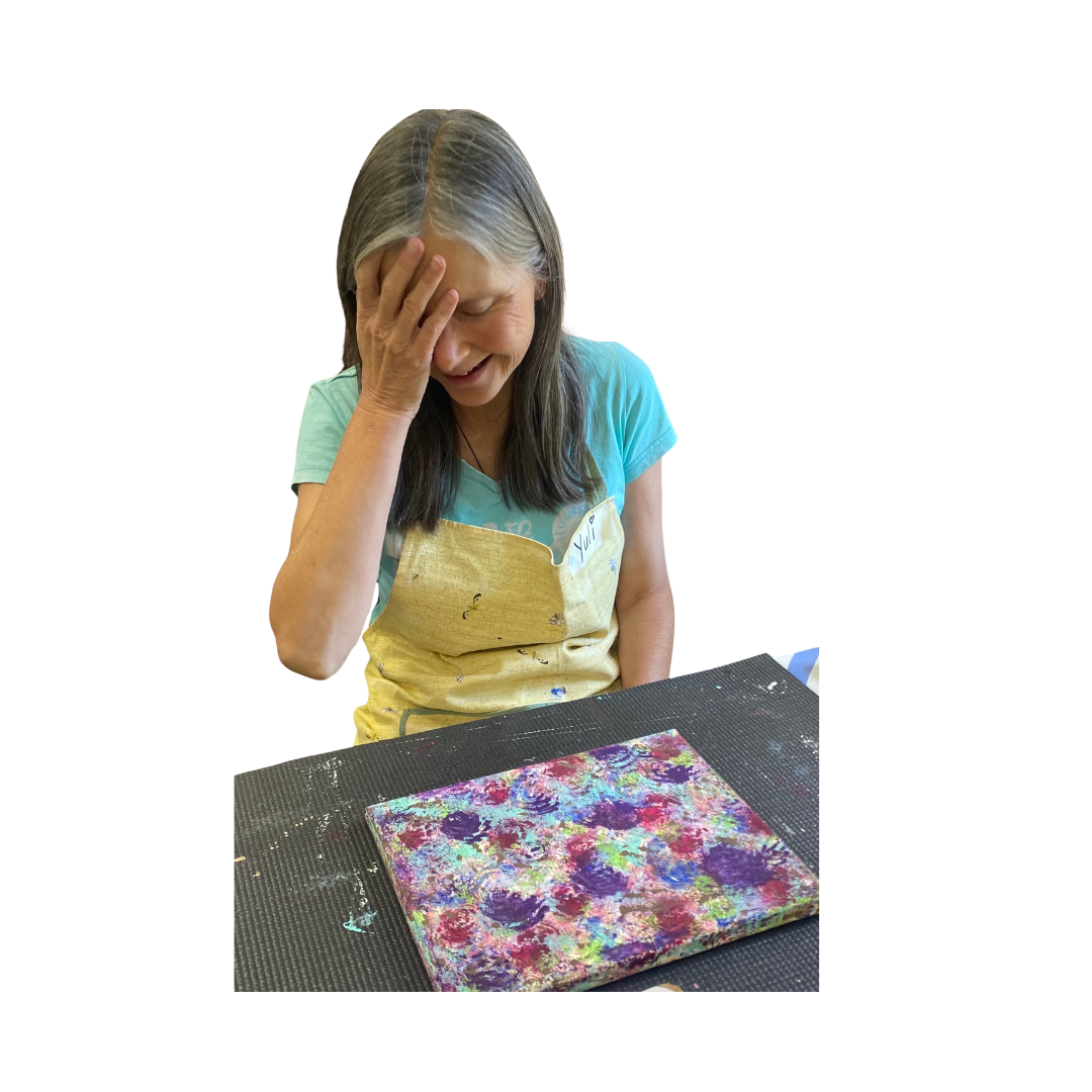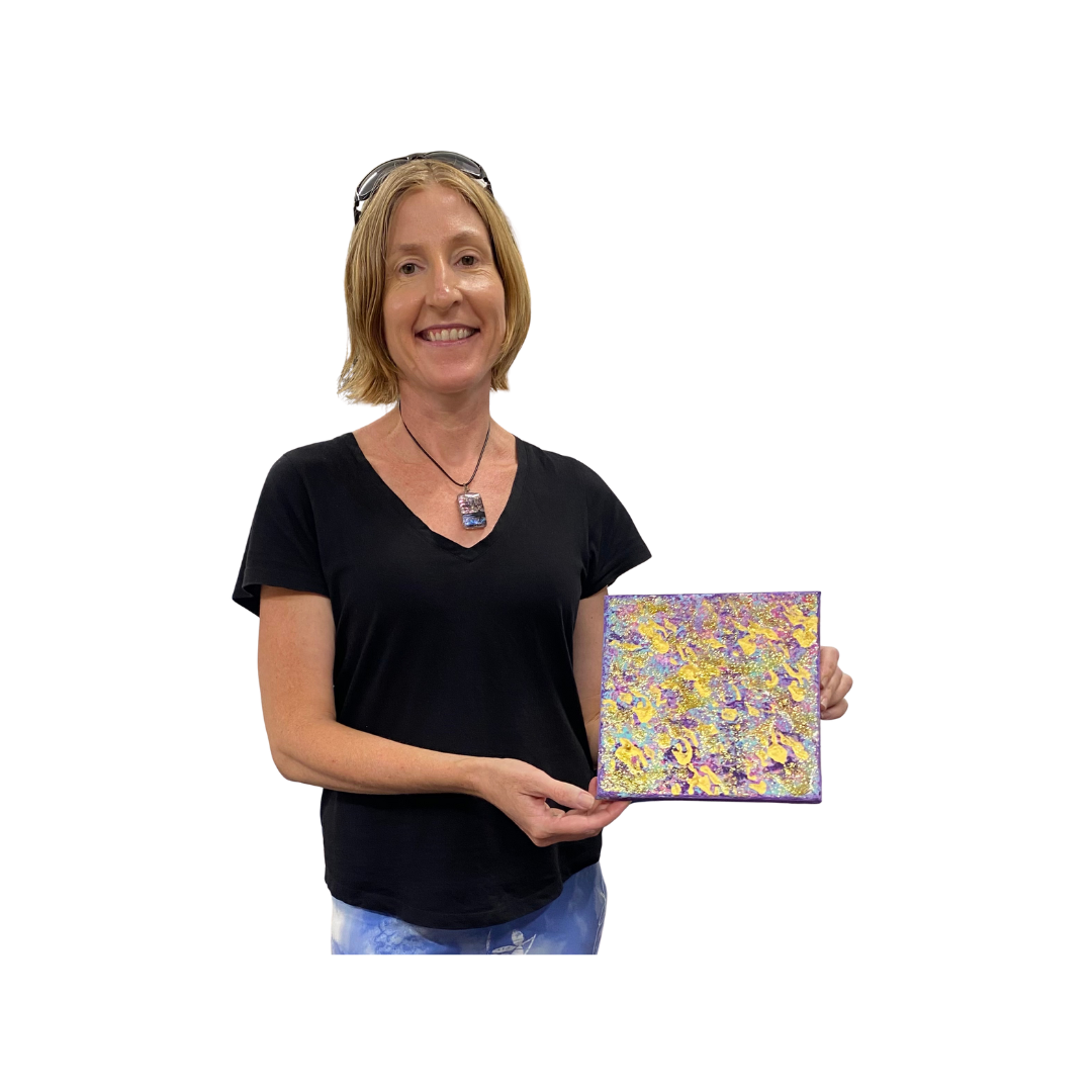"Marie’s playfulness and childlike curiosity when it comes to creativity is so inspiring. Her love of all kinds of creativity and encouragement for us to let our imagination flow without judgement and without rules for how our art should look makes for such a delightful experience. While I felt trepidation at first, contemplating what art I was going to create, Marie guided us in such a beautiful way that was free-flowing and relaxed. I was able to let go of overthinking about my art and just “do” what came to me, and I soon stopped worrying if the art would look a certain way. The free flowing of the layers of paint was such a liberating way to create art and I felt like a playful child exploring colour, texture and patterns. I am really looking forward to the next session, when I can let my inner child explore art with Marie gently guiding me along."