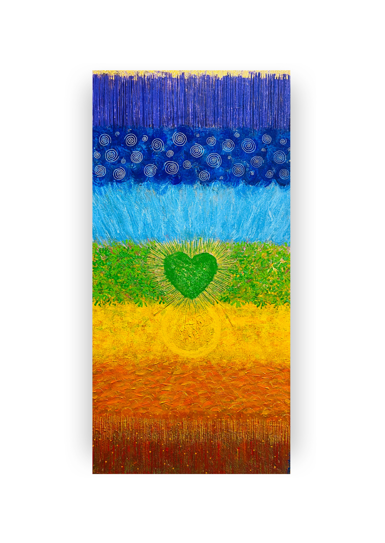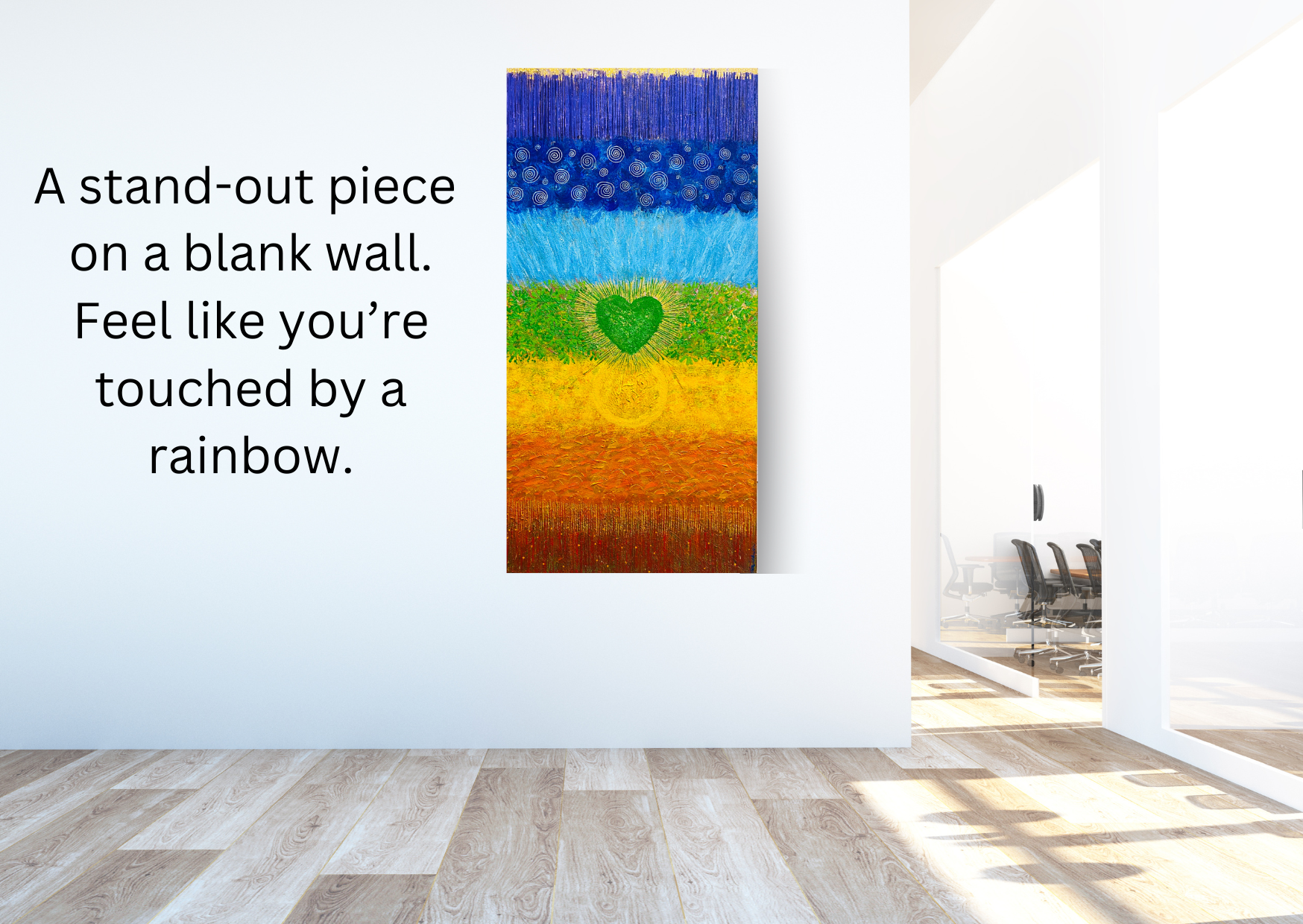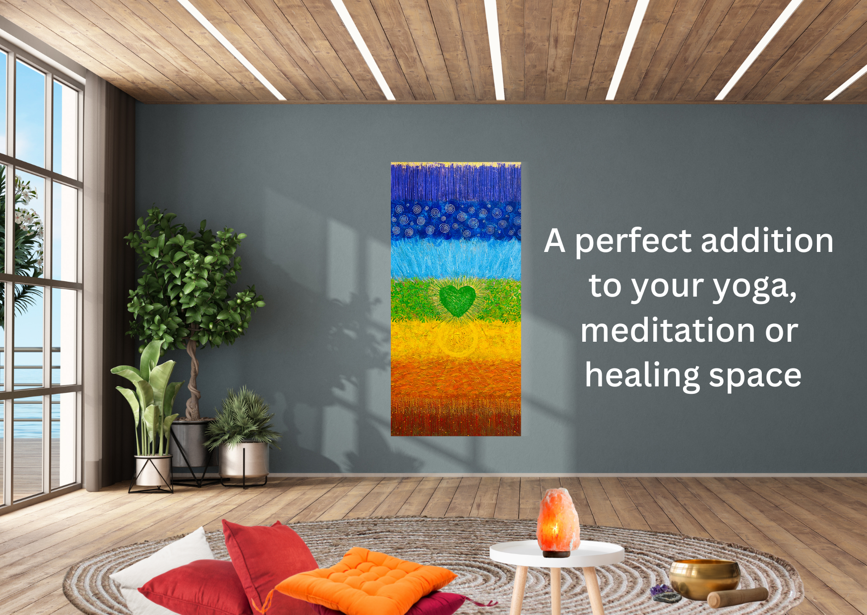 Achieve inner peace and prosperity with this carefully crafted chakra-inspired, one of a kind, piece. Designed to elevate any space with its vibrant and healing beauty, the gold and white accents symbolise spiritual growth and a pure state of mind. The heart, representing the connection between the physical and spiritual, gives this piece a truly enlightening touch that emanates love, making it the perfect addition to your yoga studio, healing room, home, or office.