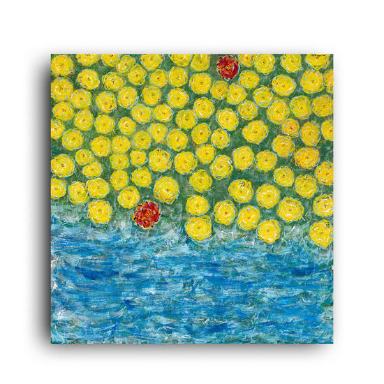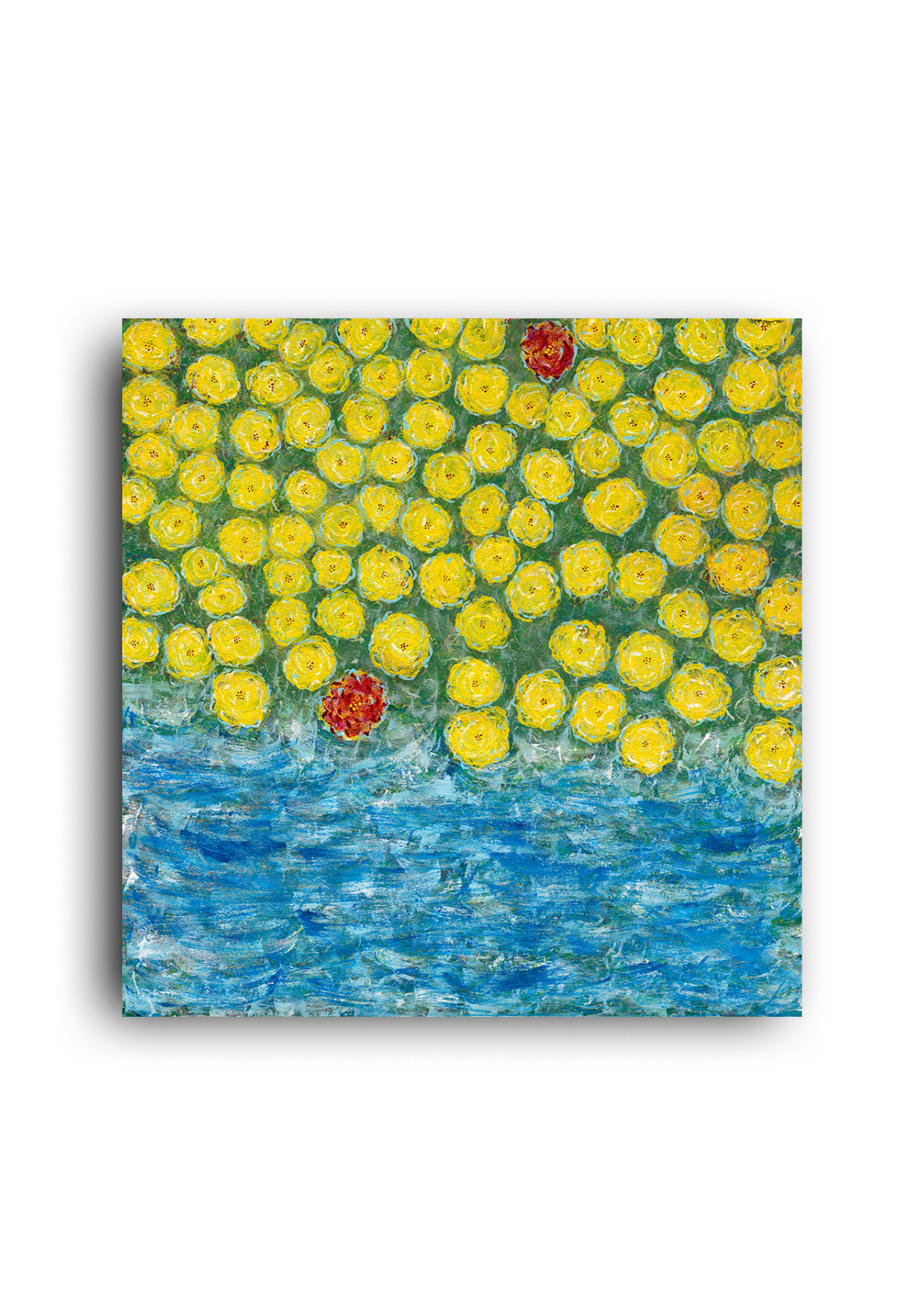 At first, I saw a field of yellow roses with one Abracadabra rose resting on a bed of green beneath a soft sky, and one Abracadabra rose floating above it all. But something compelled me to turn the painting around, and suddenly the sky became the ocean. In that moment of revelation, I cried. A healing had occurred.